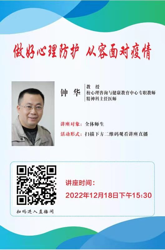 12月18日,数学与计算机科学学院组织学生在线收看“做好心理防护,从容面对疫情”的心理抗疫讲座,学校心理咨询与健康教育中心专职教师、精神科主任医师钟华教授受邀主讲。