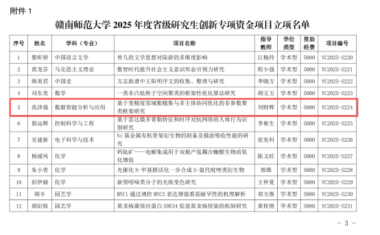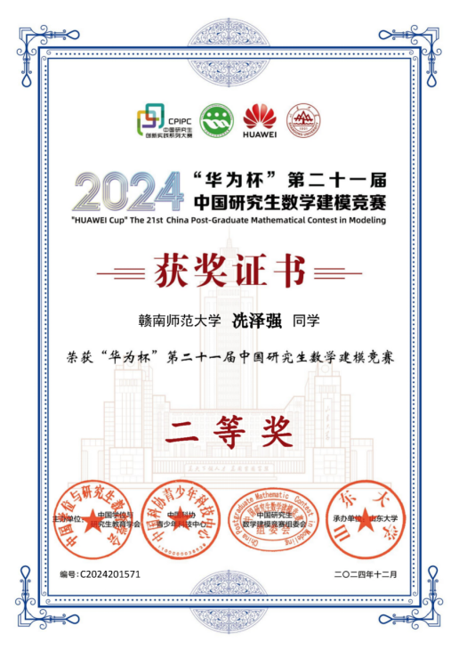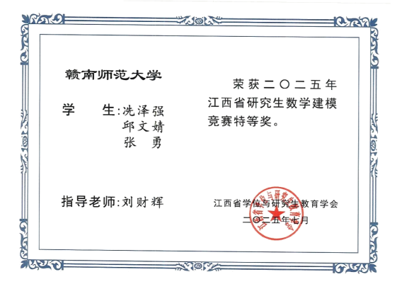 在学业竞赛方面,冼泽强同学的学业成绩与综合测评均位列班级第一,荣获2024年赣南师范大学“优秀青年志愿者”及2024-2025学年“三好学生”称号。这一年,在导师的悉心指导和团队的支持下,一步步从课堂走向赛场、从理论走向实践。与队友一起挑灯备战,最终荣获中国研究生数学建模竞赛全国二等奖、江西省研究生数学建模竞赛特等奖等奖项。