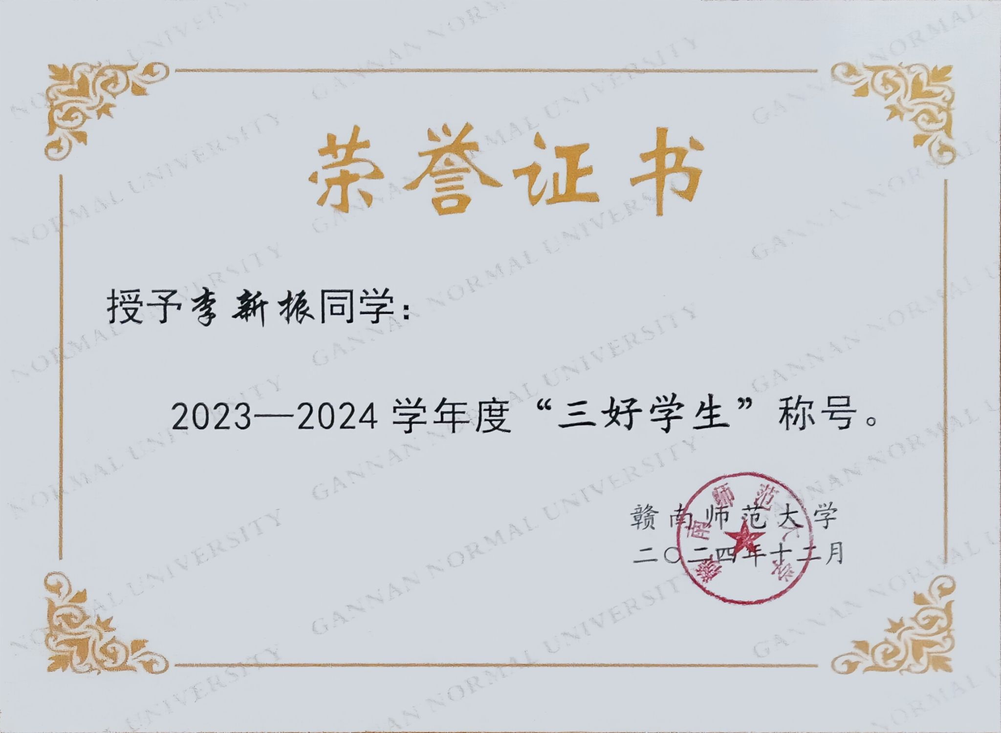李新振同学研究生入学成绩综合排名专业第一,入学后始终保持勤勉笃行的治学态度,脚踏实地深耕专业知识,以严谨务实的学风精进学业,凭借持续优异的表现荣获赣南师范大学2023-2024年度“三好学生”荣誉称号。