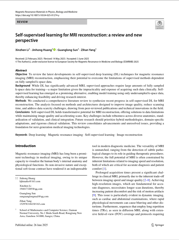 李新振同学在接触磁共振与医学成像领域之初,虽为零基础,但他深知扎实的基础是科研深耕的前提。为此,研一上学期,他深耕磁共振成像基础理论,主动拓展数学专业相关理论知识,同时广泛研读领域内高质量文献,为后续科研工作筑牢根基。进入研一下学期,他顺利进入实验室开展实操研究,凭借扎实的理论积淀与高效的实践探索,科研成果显著:截止目前为止,硕士在读期间他共撰写学术论文5篇,其中以第一(或导师第一)作者身份在医学类SCI四区期刊上发表论文2篇,1篇已提交至SCI一区Top期刊,1篇已提交至SCI三区期刊,1篇正在修改中。