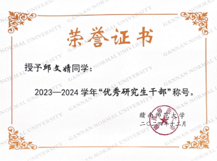 邱文婧同学发表SCI一区TOP论文1篇,累计获得国家级荣誉及奖项6项,省级荣誉及奖项7项,校院级荣誉及奖项23项,获评赣南师范大学2024-2025学年“赣师之星”。