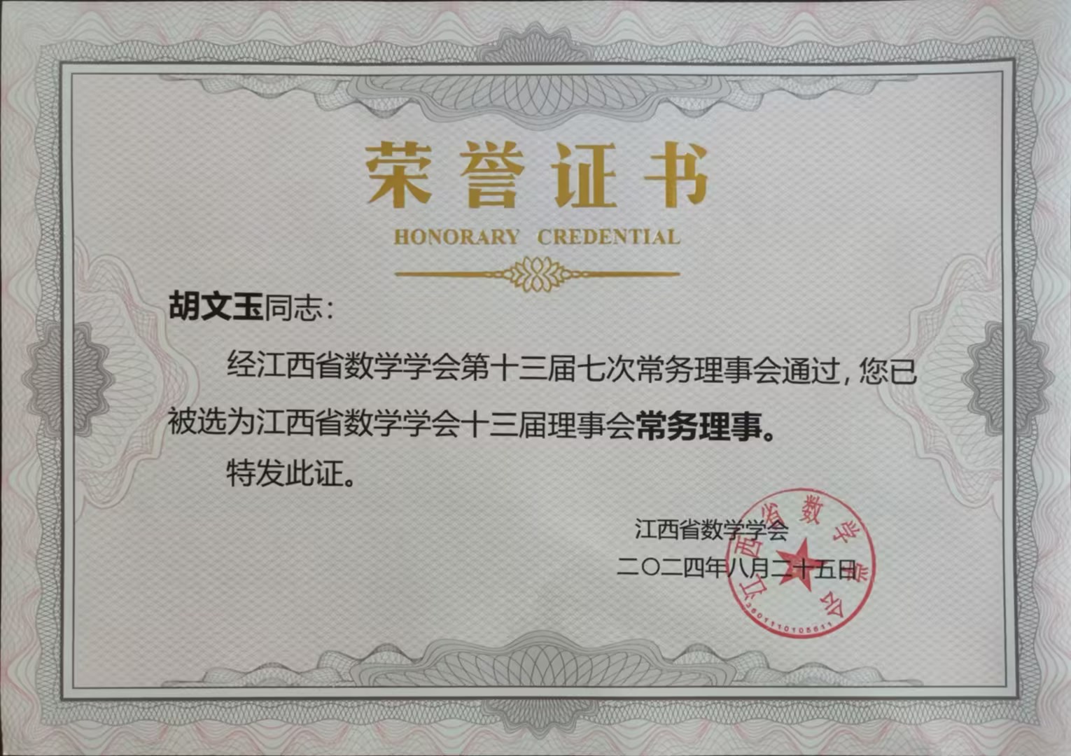经江西省数学学会第十三届七次常务理事会通过,数学与计算机科学学院胡文玉教授已被选为江西省数学学会十三届理事会常务理事。